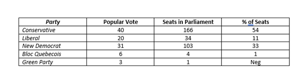 The major flaw with this system is that seats allocated to the parties are often askew with the popular vote of Canadians. For example, the 2011 Canadian election produced this result: